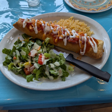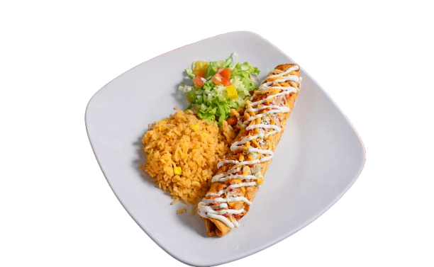A perfectly fried burrito stuffed with flavorful meat, served with Mexican rice, fresh toppings, and homemade salsa.